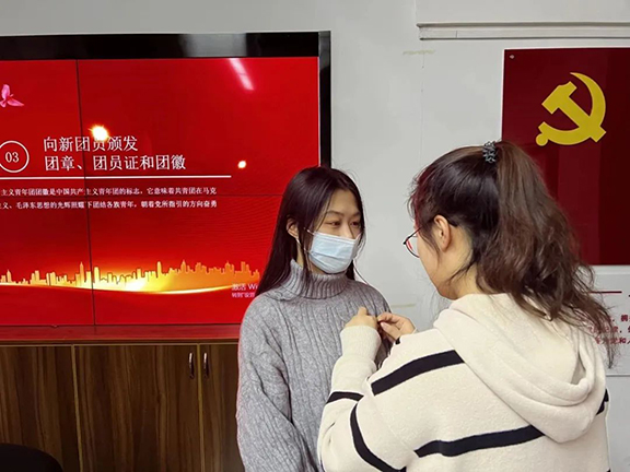 仪式在庄严的国歌声中拉开了帷幕,全体成员起立,目光坚定,充满激情地唱响国歌。主持人宣读新团员名单后,由巩珂老师为新团员代表佩戴团徽,并颁发团员证。相信每个团员在佩戴团徽的这一刻起,就明确了责任,在新的征程上不断奋进。