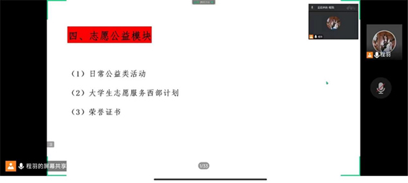 在此次培训活动中,团总支委员程羽及委员助理高俊鹏分别从“什么是第二课堂”、“学分要求”、“各学分分值表”三个方面来进行专题讲解,使同学们对于“二课”有了更加深入的了解。
