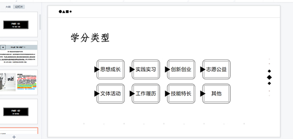 创新创业模块:包括发表论文、出版专著、专利发明、文学、艺术类、产学研转化、大学生创新创业项目、学校创业孵化基地项目、学生自主创办注册公司、“挑战杯”大学生课外学术科技作品竞赛、“创青春”大学生创业计划大赛、“互联网+”大学生创新创业大赛、中央、国家机关、政府部门主办,具有重大社会影响力的竞赛活动、行业协会类其他创新创业活动及创新创业讲座等。