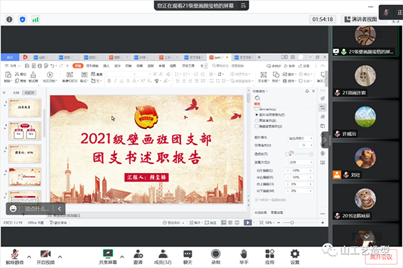 会议线上听取了2019级至2021级各年级团支部书记的述职报告。各团支部书记针对团支部人员构成、组织建设、“三会两制一课”、团费缴纳、团员教育评议、评优推优等基础团务工作等方面展开汇报,分享各自的管理经验、工作亮点特色、问题及解决对策等。汇报条理清晰、内容全面,能够从实际出发将整体各项工作落到实处,为今后团支部建设奠定了坚实的基础。