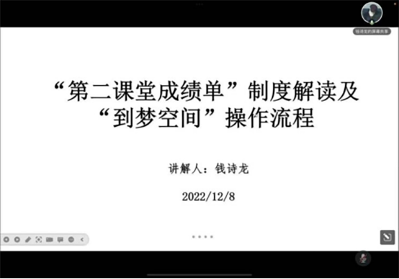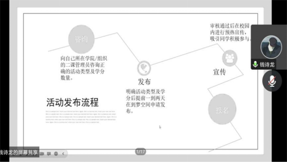会上,钱诗龙从活动发布流程、活动类型赋分和“到梦空间”管理系统三个部分进行详细讲解,全方位地介绍了“第二课堂制度”的一个理念、双向促进、三大作用、四位一体、五类课程、六项功能,引导同学们在未来的大学实践中充分利用好第二课堂的辅助作用。