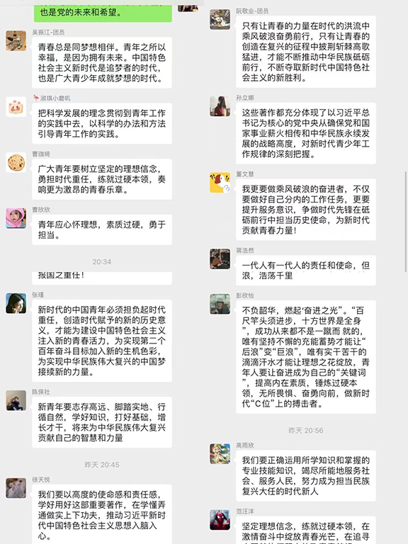 为深入了解学习党的二十大精神,更好地指导新时代青年的学习生活,学院各团支部开展学习研讨会,由团支部书记组织同学分小组围坐,共同品读学习习近平总书记的《论党的青年工作》、《习近平与大学生朋友们》(第一、二卷)、《新时代的中国青年》(白皮书)等系列著作。同学们在学习后受益匪浅并有感而发,纷纷书写心中感悟,并以线上的形式交流讨论所学所思,一致表示要谨记习近平总书记的教诲,树立高远志向,担当时代责任,成为新时代的领头人、倡导者。