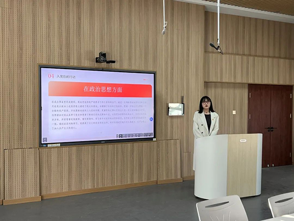 宋文静同学从对党的认识,工作经历,自身专业等方面讲述了自己入党后的感悟与体会。并结合自身经历与同学们交流分享了基层团建工作的方法和思路。引领同学们在日常的团建工作中充分发挥自身优势,在团结、组织、引领、服务同学方面用心用情用力,扎实做好班级的团建工作。