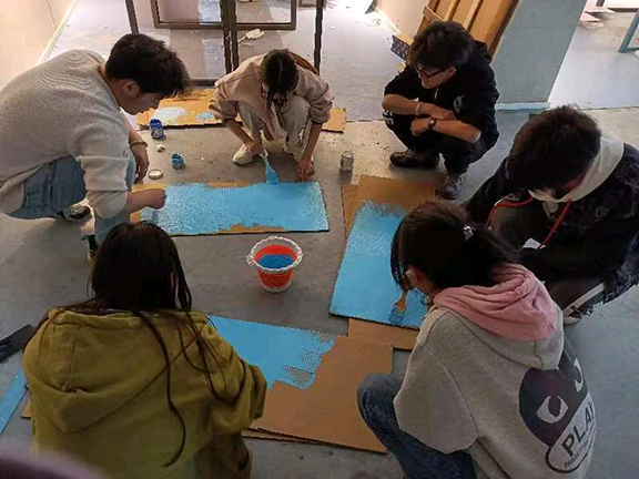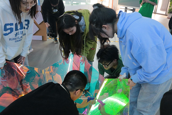 志愿者们结合自身专业优势,围绕“元宇宙”进行策划和创作,并准备好亚克力板与镭射纸等材料。