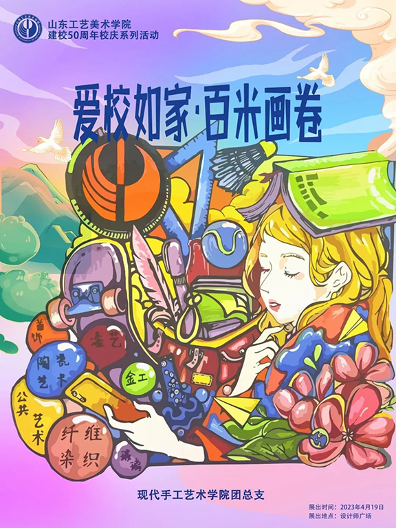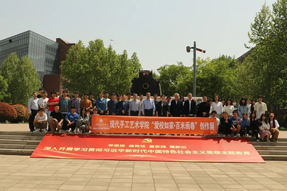 为深入学习宣传贯彻党的二十大精神,为建校五十周年献礼,2023年4月19日,现代手工艺术学院2022级团支部“爱校如家 百米画卷”创作展在长清校区设计师广场举行。