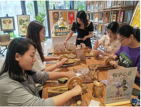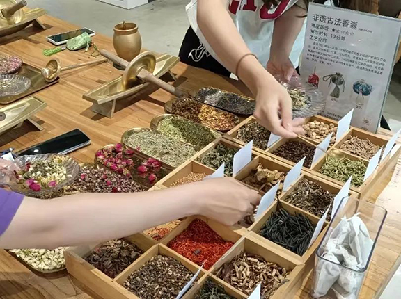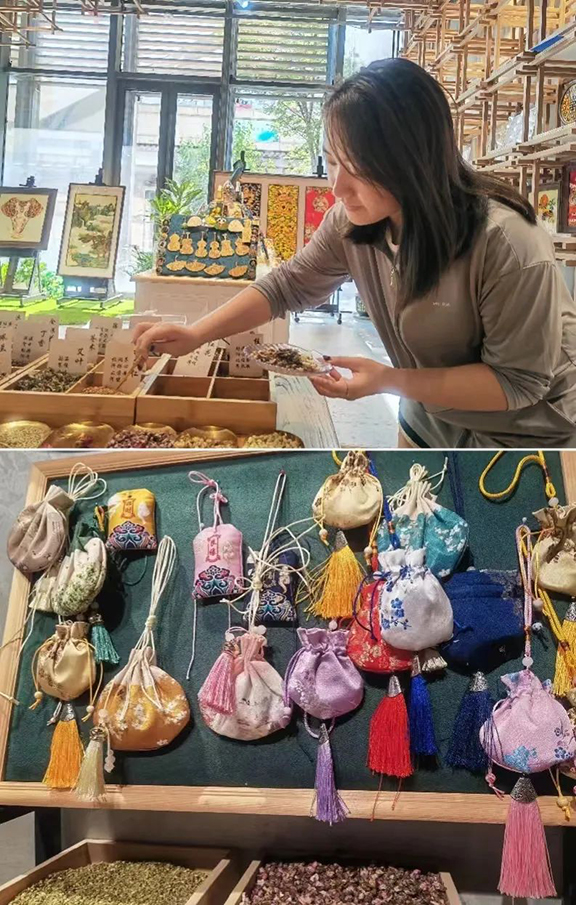 活动现场,非遗文化传承者为大家详细讲解了香囊的原料、功效以及制作方法,同学们兴致盎然,认真聆听,随后便有条不紊地按照步骤来规范制作香囊。从挑选样式到填充香料再到钉扣收尾,同学们切身参与到每一个环节,在一锤一捣的研磨中,在一针一线的缝合中,体会到非遗文化的博大精深。同时,遇到困难还会相互讨论,互帮互助,现场气氛融洽热烈,每个人都将最美好、最真挚的祝福注入进香囊里。活动最后,大家把精心制作的香囊置于展示架之上,清幽的香气一瞬间弥漫开来,为端午佳节增添了一份浓浓的韵味。