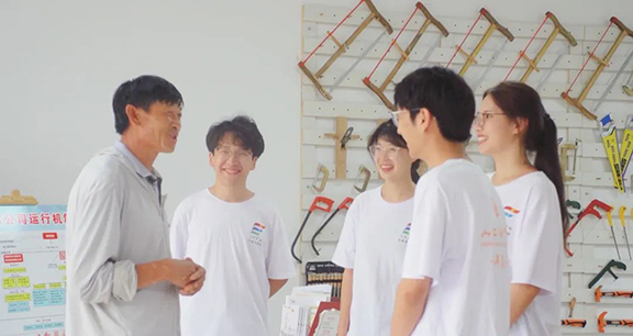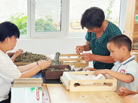 开班仪式结束之后,为进一步了解计宝裕村的乡村发展史,实践团对计宝峪村党支部书记冯成文进行了采访。冯成文表示,抓经济就要抓文化,抓文化就要抓孩子。计宝峪村历史悠久,拥有优秀的历史底蕴,因此儿童研学基地应运而生。计宝峪村以“峪见童年理想生活村”为发展主题,作为“淄博市中小学生研学基地”、“山东省食育研究与实践基地”积极探索推进儿童友好型乡村建设,以“传统乡村生态基底+研学活动体验”为手段,打造淄博乡村研学新名片。采访结束之后,实践团参观体验了计宝峪儿童研学项目,项目内容包括制作艾条、刻制木梳、活字印刷、书屋阅读等。