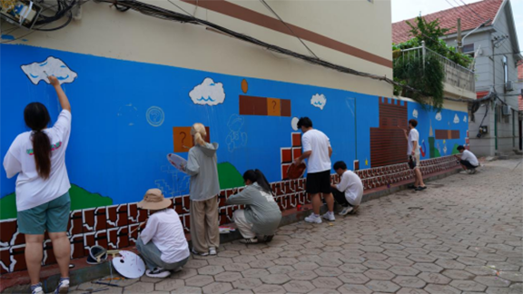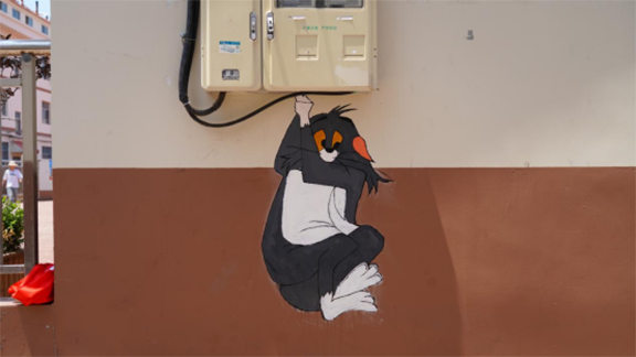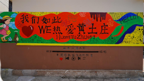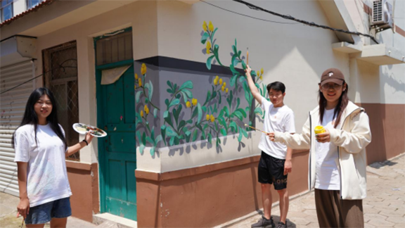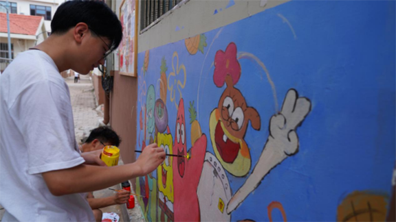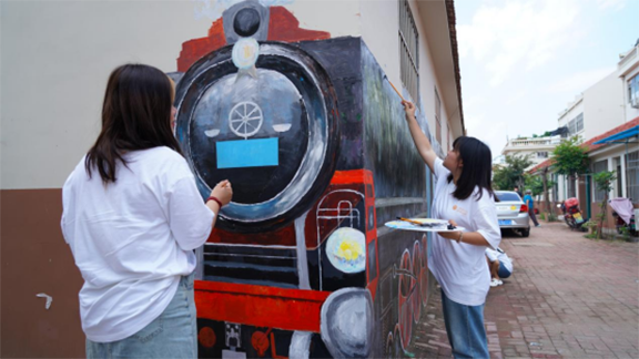 同学们迅速开始设计、起稿、绘画。随着一幅幅作品完美呈现,村民们赞叹的声音慢慢响起,学生们顾不得照在脸上火辣辣的太阳和滴在调色盘里的汗水,在骄阳下笔不停歇,用专业书写乡村振兴的华章。他们把所想画在墙上,为社区营造新风貌的同时也为自己留下属于青春的记忆。