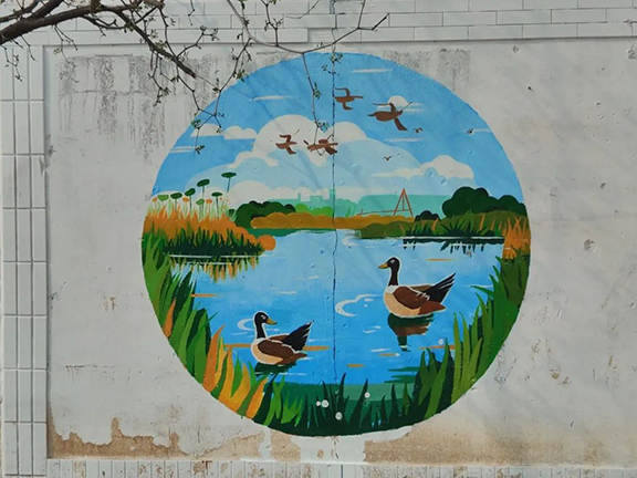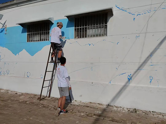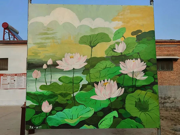 刘付老师和裴雨晨老师就尺幅调整、构图上色、细节调整、安全事宜进行讲授,并对人员安排和绘制工作进行了细致分工。队员们整理好油漆、水桶、刷子、颜料等工具,前往各自负责区域开始进行绘制工作。日均40℃的高温天气,队员们头顶烈日,不惧酷暑,克服了降雨、蚊虫叮咬、因恐高而无法攀爬手脚架等问题。从早晨五点到晚上8点,打线、画线稿、调色、上色、勾边到最后的整体画面呈现,队员们一丝不苟,在互相配合中逐渐形成默契。从池塘、荷花、节气图到长幅山水画,队员们一笔一画地为刘李新村绘就出一幅幅美丽乡村新画卷,让动人的景象生动呈现在村庄的各个角落,用色彩诠释美好乡村生活。同学们顶着烈日绘制墙绘的样子,让村民们看在眼里、记在心里,纷纷竖起大拇指,不少村民自发送来西瓜、饮料给同学们解暑降温。