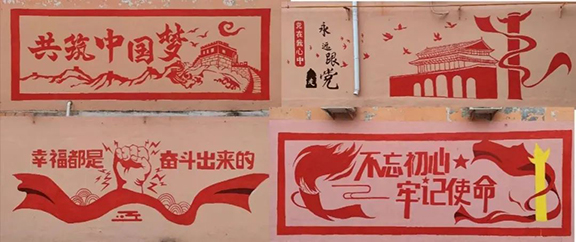 在实践活动期间,“艺堂”希望小队利用自身专业优势进行了实地调研并设计完成4幅墙体彩绘,将“不忘初心、牢记使命” ,“永远跟党走”,“共筑中国梦”,“幸福都是奋斗出来的”等口号标语融入画作,不断丰富墙体文化内涵,让村民在潜移默化中接受党性教育。实践过程中“艺堂”希望小队全体成员用较短时间高效率、高质量完成了墙绘绘画活动,成为章丘区普集街道普集西村一道亮丽的风景线。此次“青年手绘青春”墙绘活动圆满完成,受到当地领导和居民的一致好评与认可。