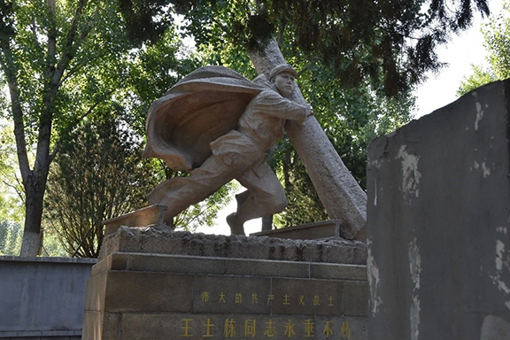 在济南鹊山脚下,有一座拥有百年历史的铁路大桥—泺口黄河铁路大桥。在这座大桥旁有一尊王士栋烈士雕塑,矗立在青松绿柏之间。他肩扛枕木,保持着英勇抢险时的冲锋姿态。1967年5月31日晚暴雨突然袭击济南,堆积在泺口黄河铁路大桥桥头的原木被大风吹落在道轨上,眼看一场车翻、桥毁的事故就要发生,王士栋不顾个人安危,冲上前把一根根横放在钢轨上的圆木奋力扔出,就在他竭尽全力将最后一根木头扔出时,列车呼啸而过,年仅21岁的王士栋,生命永远停留在了此刻。