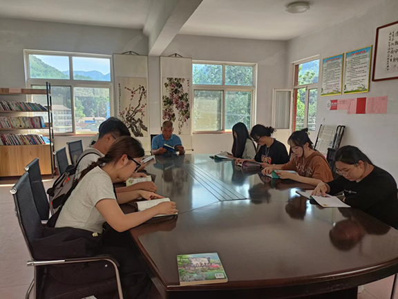 团队成员随后来到改造后的老年活动中心。由于村子位置偏僻,年轻人和孩子都不太愿意在村里生活,所以村子里现在有一半以上的人口都是老年群体。活动中心虽然场所不大,但功能全面,配有老年人休息室、书法室、锻炼活动室以及图书阅览室等。目前,整个活动中心还处于建设当中,后期团队成员可以结合专业知识,为老年活动中心做一些设计方案。