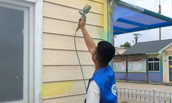 清衿之志,履践致远。成员们结合自身的专业知识和当地需求,对游客接待中心进行墙体喷绘设计。在设计过程中,融合当地文化及彩虹小巷的含义,进行喷绘美化,突出展示了乡村旅游特色。