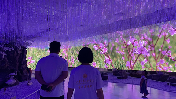 “四季如歌”展厅里给队员们极大震撼的是黄河三角洲的实景展示,有“白日依山尽”的壮丽景象,也有“长河落日圆”的唯美画面。场馆采用国内较大的LED屏和三折幕技术,配上优美音乐,辅之以上空三色变幻灯,在现代声光调控的配合中,人们仿佛走进了一帘幽梦之中。