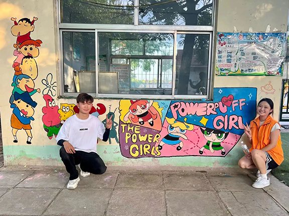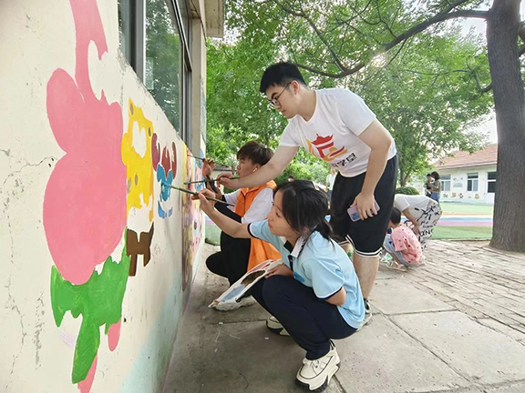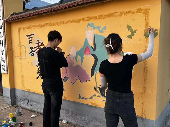 “快乐学习”的课堂上呈现出一幅幅生动的画面。孩子们在团队成员的带领下,拿起画笔,共同为乡村幼儿园、乡村幸福院的墙面绘就出和美乡村美丽画卷。团队成员与孩子们一起在共同劳动中学习“工匠精神”敬业、精益、专注、创新的深刻内涵,树立劳动观念,培养劳动习惯,提高劳动能力,用奋斗和劳动燃点青春、淬炼成长。