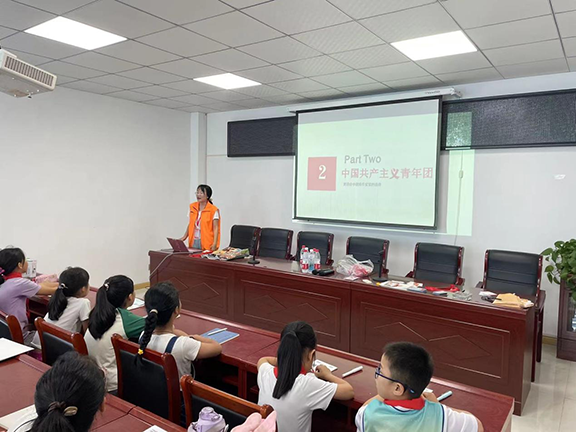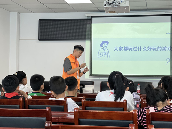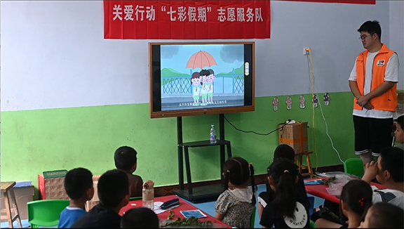 在“思想引领”课堂上,团队成员以中国共产主义青年团第十九次全国代表大会精神为指导,融入红色文化元素,聚焦爱国主义教育,从设计和美学的角度对团徽中的团旗、齿轮、麦穗等元素设计进行了解析,激发起孩子们浓厚的家国情怀。在“文明生活”课堂上,团队成员分别从防溺水、交通安全、消防安全、饮食安全及突发情况的急救知识等方面给孩子们讲解了相关的安全防范知识,并运用道具讲解了垃圾分类相关知识,引导孩子们在日常生活中养成文明、规范处理垃圾的好习惯,树立文明新风尚。