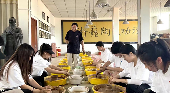 随后,成员们前往中国龙山文化黑陶研究中心,与刘德功黑陶艺术馆馆长刘德功进行调研交流。在体验馆内,成员们跟随刘德功的引领的讲解,躬身体悟黑陶"黑如漆,亮如镜,薄如纸,硬如瓷"的独特优势和鲜明特色,了解了龙山黑陶作为龙山文化核心的历史源头。同时成员们实地调研了黑陶制作工坊,体验了黑陶的制作工艺,更深入地感受了黑陶文化的独特魅力。参观结束后成员们与刘德功座谈交流了龙山黑陶在传承发展中存在的现实问题,聆听了刘德功对于黑陶文化未来发展路向的建议和指导,为成员们探索和创新传统黑陶工艺,并与现代艺术设计相结合提供了思路。