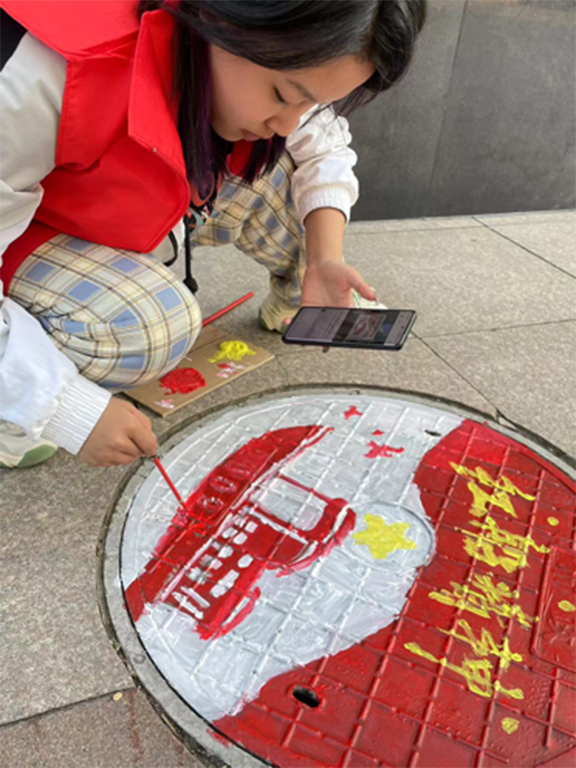 在活动过程中,志愿者充分发挥各自的创意和想象力,将红色主义精神巧妙地融合在艺术创作中。井盖上或绘制了正能量标语,或以红色故事为背景创作,生动呈现了社会主义精神内涵。它不仅是一次艺术的实践,更是推动红色精神的契机,展现艺术赋能红色文化的新时代风尚。