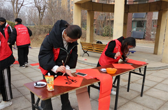 实践心得:为了弘扬传统文化,传播社会主义核心价值观,增强群众的文化自信,2023级书法班组成了迎新送福社会实践队,开展“送春联”实践活动。活动中,同学们与社区志愿者共同参与,现场书写春联,将祝福送到千家万户。居民们收到春联后,纷纷表示感受到了节日的气氛和社区的温暖。送春联社会实践活动,既是弘扬传统文化、传播社会主义核心价值观的举措,也是当代大学生了解社会、融入社会的一个窗口。在实践过程中,队员们遇到了小小的挑战和问题,但都找到了适用的解决方案。通过本次活动,不仅让社区群众感受到了节日的气氛和温暖,让其对传统文化有了更深的了解和认同,队员们自己也增强了社会责任意识,践行了书法本专业技能。