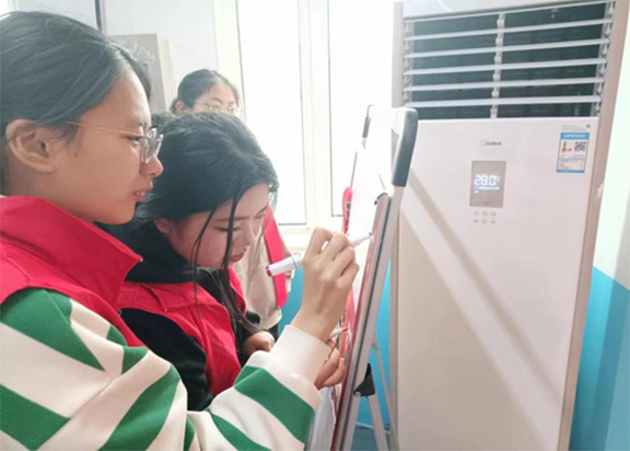 (图为“红色行者”社会实践队成员共同绘制宣传白板)