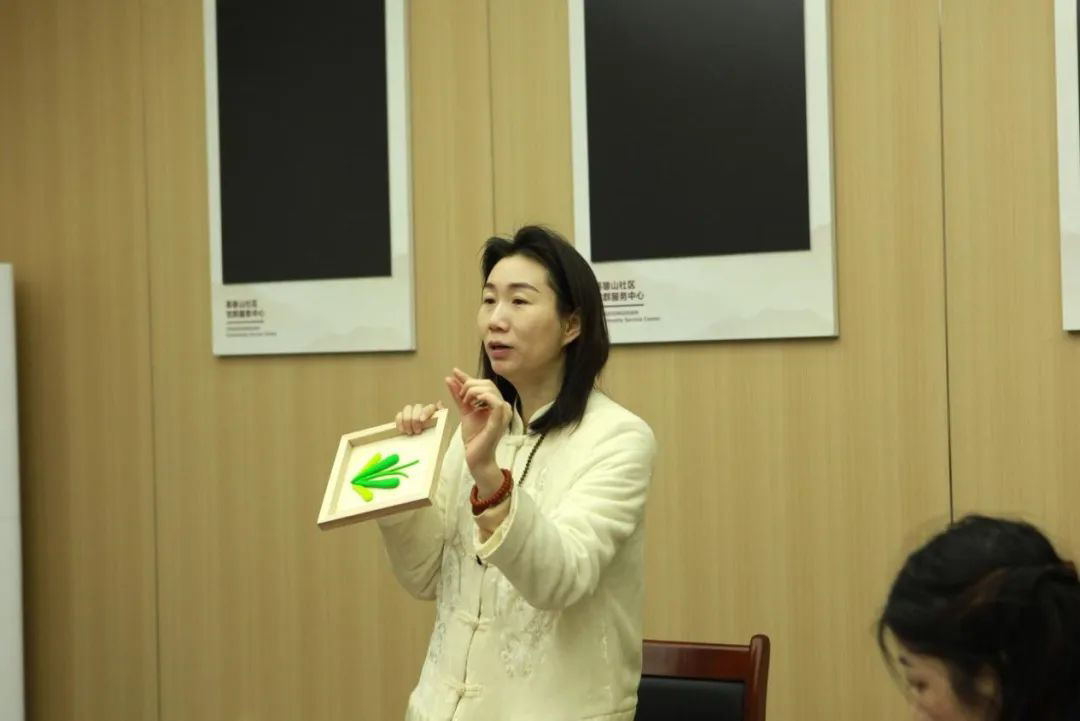 随后,刘老师讲述了“二十四番花信风”节令用语的由来,并以此为题,进行花草面塑制作示范。示范完成后,志愿者们向社区居民分发面塑材料,与社区居民共同完成揉、搓、捏、挤、刻等制作工序,最终一件件精美的《惊蛰》作品呈现在大家眼前,使大家感受到了传统文化的魅力和趣味。