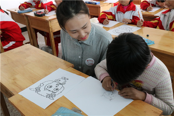 首先大家与学校的老师进行交谈,并参观了各类活动教室,简单的了解双泉镇中心小学孩子们日常课程基本情况。其次,同学们给孩子们上了一节简笔画课程。由陈中辉,聂紫瑶担任主讲,在黑板上进行了示范画,可爱的卡通形象一下子吸引了孩子们的注意力,每一个孩子都迫不及待的动起手来。爱心社的同学们带着饱满的热情,倾尽所能细心、认真、耐心的教孩子们画画,将自己所知道的绘画方法告诉了孩子们,并对有疑问的孩子给予了帮助。很快孩子们就相继完成了自己的作品,尽管这些作品都带着些许稚气,但孩子们真诚且稚嫩的笑脸和充满想象力的画面让整个教室都充满了欢声笑语。