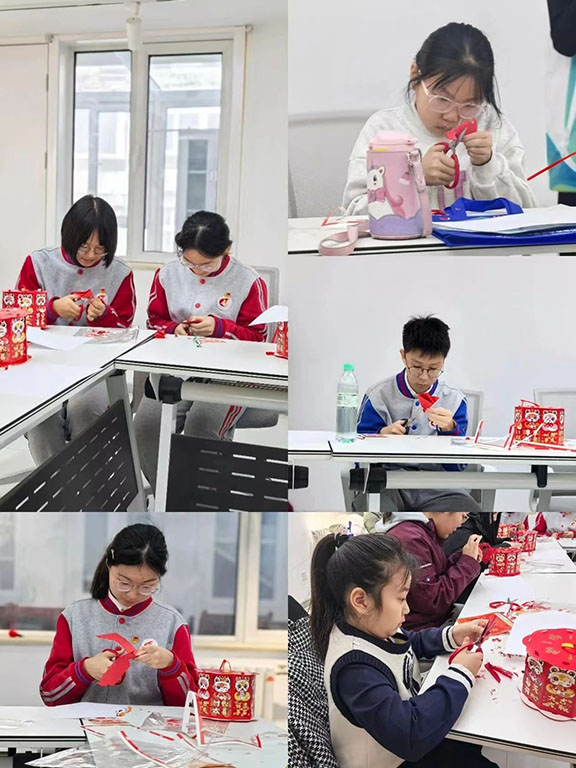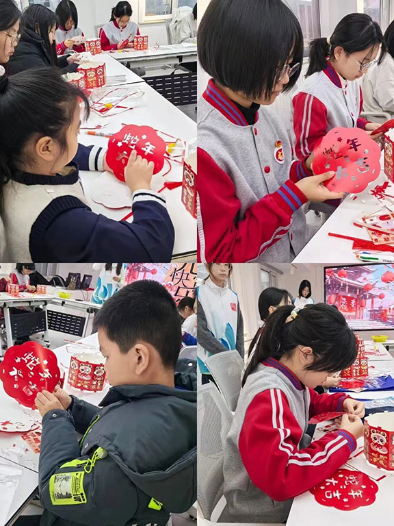 在花灯制作教学中,我们引导孩子将手中的制作材料有序拆解,按照要求和步骤进行组装。大家相互协作,讨论制作方法,开拓了思维,也增长了见识。在剪纸技艺教学中,通过示范基础纹样剪法,引导孩子们掌握对称、连续等剪纸技法,并指导他们完成富有节日气息的剪纸作品。同时,还设置作品展示和交流环节,让大家在互相学习中提升技艺,感受传统文化的魅力。