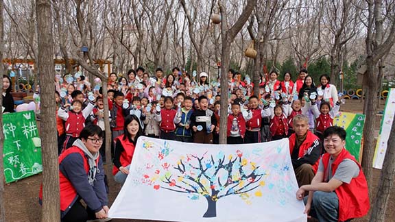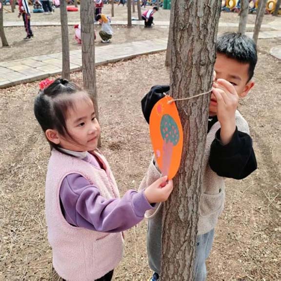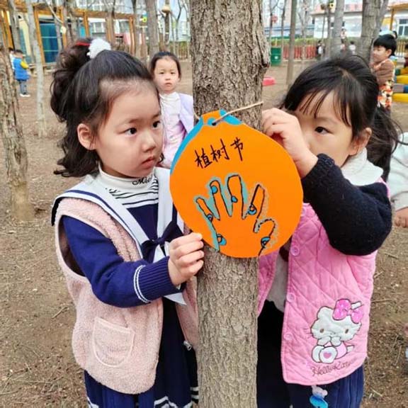 志愿者们指导小朋友制作了手工小树牌,写下了环保标语。手工树牌制作完后,小朋友们在老师的带领下将亲手绘制的守护牌,挂到了“树朋友”的身上,用行动践行绿色承诺。