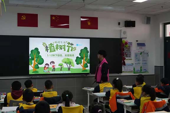 活动中,志愿者们和一年级的小朋友们一起学习了植树节的起源、发展历程以及背后蕴含的文化意义,通过生动的讲解和视频素材,让同学们认识到生态保护对人类生存、社会发展以及地球未来的深远意义。鼓励水鸣街小学的“小水滴们”用行动践行环保理念,为大地增添一抹生机勃勃的绿色风景。