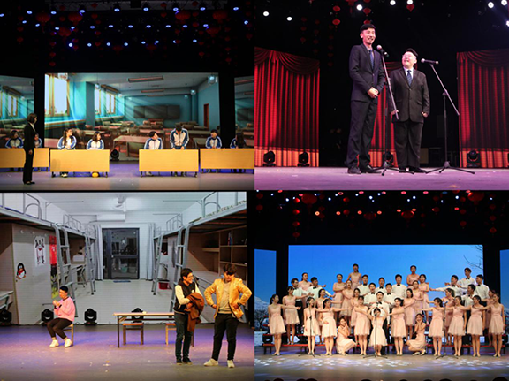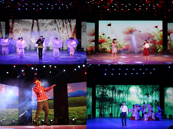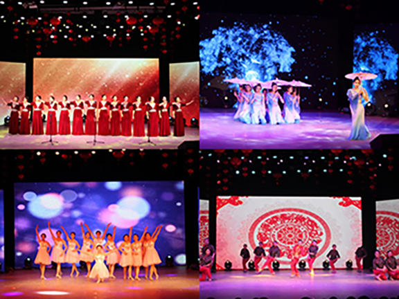 晚会伊始,开场歌舞《福气东来》结合舞狮献瑞,引爆全场,晚会洋溢着欢快喜庆的气氛;校匠心合唱团的合唱《午后》唱出了工艺美院丰富多彩、温暖美好的校园生活;董彦彬、王文学带来的相声《欢声笑语》幽默诙谐,引起了全场观众的阵阵喝彩。由校礼仪队的同学们带来的舞蹈《丽人行韵》展示着豆蔻少女们的婉转柔情,婀娜的身躯袅袅而行,一颦一笑中满是古典韵味;往届十佳歌手郭家展带来的的《牧马人》将大家带到了美丽的草原,让观众们领略了牧马人的风采;工会老师带来的舞蹈《我和你》,用最轻柔的舞姿表达了对同学们最深切的新年祝福;由第十四届“火焰杯”十佳歌手们联合演唱的《咖喱咖喱》、《带你去旅行》、《远走高飞》等歌曲,曲调或悠扬深情、或热情奔放,将全场氛围引向高潮;之后由国学社带来的《相和歌》将朗诵和舞蹈完美融合,带我们重新领略了中华诗经之美,更展现了国学文化的无穷魅力;话剧社《一觉醒来》以幽默的方式教育当代大学生要积极进取,珍惜大学时光;大学生艺术团团长薛钦文与校倾扬舞蹈团带来的歌伴舞《中国字画》恢弘大气,如梦如幻,中国传统书画艺术在歌手的演唱和柔美的舞姿中汹涌而出;舞蹈班同学们带来的舞蹈《老妹儿》以其灵动柔美的肢体语言生动的将女子由喜嫁到哭嫁的过程展现的淋漓尽致,赢得现场阵阵掌声;最后,晚会在工会老师们一曲恢弘大气的《中国梦》中圆满结束,观看本次演出的领导老师纷纷上台与演员合影留念。