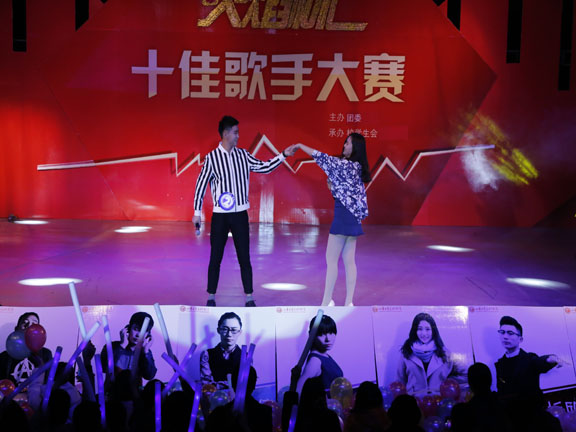 舞舞协会的劲歌热舞拉开了本次大赛的帷幕,来自各个学院的10位选手在大家的翘首等待中展开了激烈的角逐。数字演播厅座无虚席,所有在场观众都被比赛所吸引,激动不已。在主持人的介绍下,比赛正式开始。第一个环节,10位选手依次登台演唱了自己精心准备的歌曲,《十年》、《七里香》、《北京,北京》等耳熟能详的歌曲,将晚会的气氛点燃。不同唱法,不同风格,博得了观众们的欢呼和掌声。参赛选手的镇定自若,对歌曲的演绎和台风,展示了他们的自信与实力,很快将本次赛推向了高潮。大赛第二个环节,由晋级的六位选手抽签组成两两对战,共同演唱曲目,每组晋级一名选手进入了接下来的冠军争夺战。经过评委的慎重选择,张青山,张渭青,时政远三名同学顺利晋级。最后一个环节,由2号选手张青山,3号选手张渭青,4号选手时政远进行冠军争夺战,把大赛推向了又一次的高潮,最终张渭青以一曲《那些花儿》夺得了本次大赛的冠军,张青山与时政远分列亚军,季军,其他选手也分别获得了最佳歌手奖和最具人气奖等奖项。最终大赛在《以青春之名》得合唱声中圆满落下了帷幕。