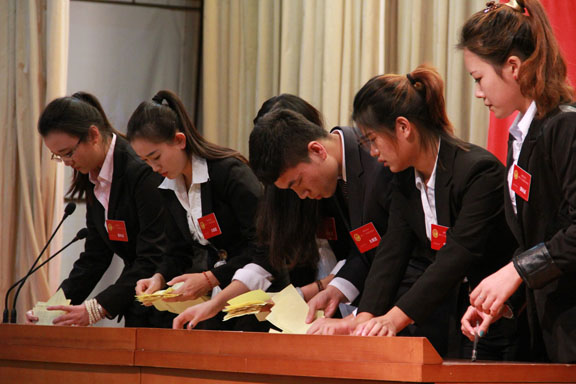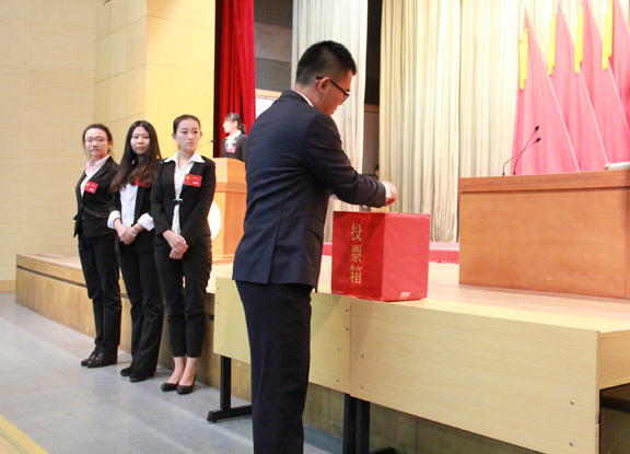 会议第三阶段,大会公布第二十二届学生会委员的选举办法以及监票团名单,随后由第二十二次学生代表大会委员候选人依次上台演讲。精彩的演讲使学生代表对候选人有了更加深入的了解。接着,在总监票人及监票人名的监督下,会议进行无记名投票, 经过大会监票团的审核,选举产生了第二十二届学生代表大会委员。随后,由新当选的学生代表大会委员代表发言,最后由第二十一届学生会主席团成员对大会致闭幕词。至此,永利官网第二十二届学生代表大会圆满落幕。