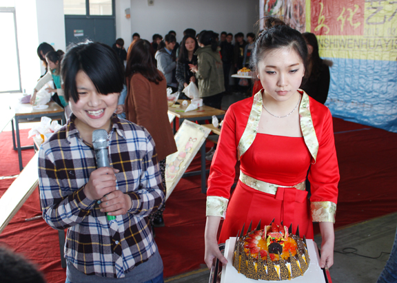 活动伊始,由主持人介绍各支参赛学院代表队,并分两组上场进行比赛。比赛过程中,场上每队选手都专心于“建造”各自美观而又营养的蛋糕中。与此同时,主持人带动场下观众参与削苹果比赛和问题抢答比赛。二十分钟后,选手们出色的完成了蛋糕的制作并向评委和观众进行展示。最后,第九届“饮食文化节”活动开幕式暨蛋糕DIY比赛进入尾声,建筑与景观设计学院、数字艺术与传媒学院、人文艺术学院和服装学院获得第三名,造型艺术学院、应用设计学院获得第二名,冠军得主是现代手工艺术学院和工业设计学院。