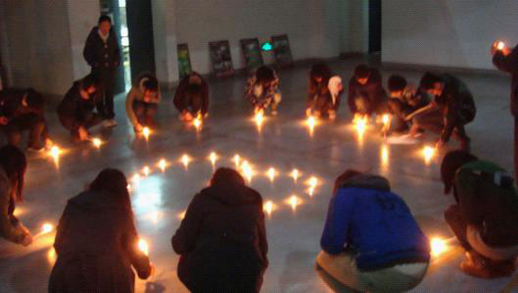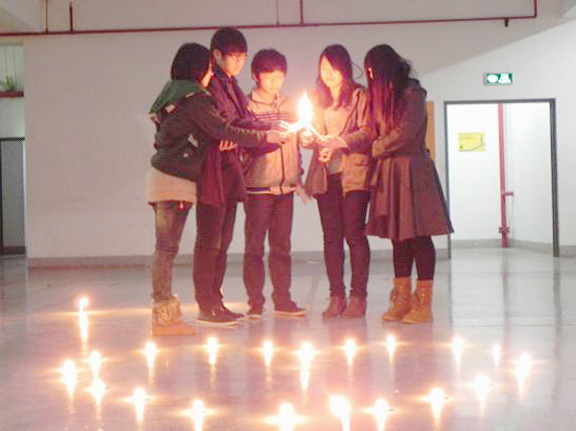 晚上6:30祈福活动正式开始,永利官网校学生会社团部日语协会会员在大厅中央提前用蜡烛摆成了一个心形,同学们每人手中持着一支白蜡烛,面向里围成一圈。然后会长葛景昂发表了讲话,简单介绍了一下日本本次地震的情况,以及伤毁程度,并对遇难者表示深切哀悼,并祝愿日本人民早日克服困难,重建家园,随后在场的每位同学向遇难者默哀三分钟,希望大家的祝福能到达灾区人民的心里,感受到我们的温暖。