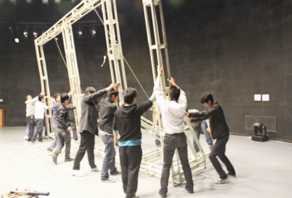 经过前期的计划与准备工作,在开始搭台前就已经有了一套系统的工作流程。在会场布置的期间,首先各部部长及其干事一同准备了会场布置所需要的钢架等材料。之后,十八届筹委会成员甘文与各部部长讨论并商定会场布置中海报悬挂所需钢架的组装步骤并嘱咐干事们在工作中的注意事项。最后,体育部、宣传部等部门在校后勤人员的帮助下开始组装海报悬挂钢架,在组装工作中,校学生会成员发扬不怕吃苦,认真踏实的工作精神,成功的组装了一个主海报悬挂架和两个副海报悬挂架,并按要求摆放在指定位置,为永利官网第七届“火焰杯”大赛的召开做好前期硬件的准备工作。工作期间,团委老师邹晓红视察了工作现场并对海报悬挂架的组装工作提出了几点建议,邹老师提出,在舞台的搭建与布置工作中一定要充分注意安全问题,做好相应的安全保障;其次要树立严谨的工作作风,不能在舞台的搭建、布置过程中出现人为地故障隐患。