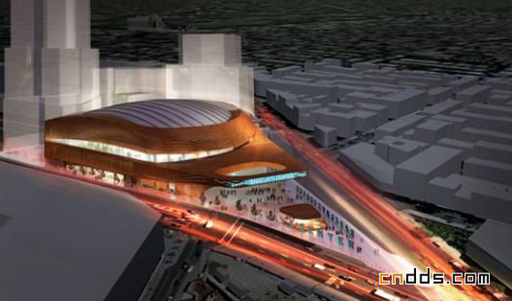 在过去一周, Becket和SHoP推出第三个版本675,000防止污染的舞台。这种设计采用了Gehry的一些原始的想法,如从人行道上开到舞台打开了风景。 SHOP的新外观,一铁锈色的皮肤编织出风化钢板,具有很好的韧性,一定意义上有助于它在其周围适合。冲孔孔将令建筑出现在夜间发光。