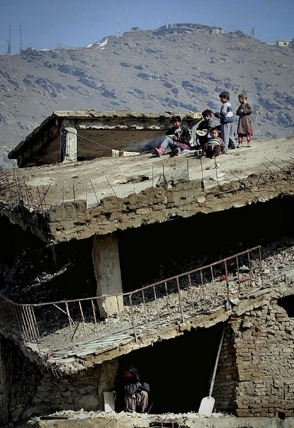 一些儿童在几乎毁于战争的房屋顶上玩耍。(2003年6月20日;阿富汗喀布尔)