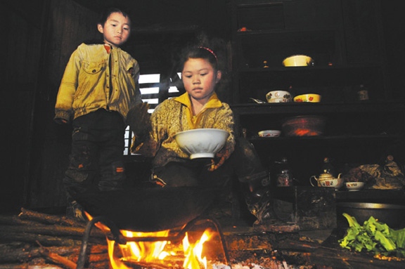 10岁的杨紫洲正在给6岁的弟弟杨天坪做饭。在中国偏远山区,因为家庭贫困、路途遥远,午休时,学生们往往带来地瓜或冷饭充饥,不少孩子甚至在学校数年从未吃过一顿午餐,挨饿上课。社会福利教育基金提供的“免费午餐”,为他们送去了前所未有的快乐。(2011年6月15日;中国湖南)