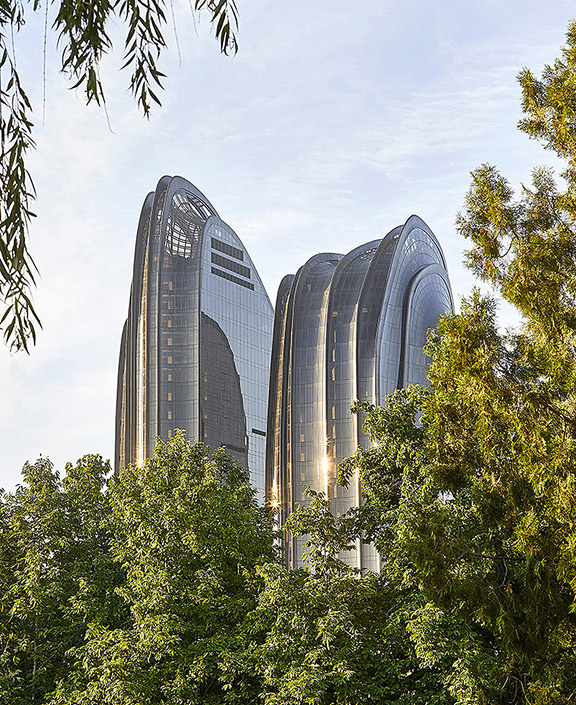 马岩松和他带领的MAD建筑事务所历经6年,近日完成了“墨色山水”——朝阳公园广场及阿玛尼公寓建筑群。地处北京朝阳公园的南面,建筑群总建筑面积约22万平方米,由10座建筑组成,高低错落,好像一幅展开的山水画卷,又像是一组盆景。不同于纽约中央公园边上那些强调边界围合感的现代建筑,北京这组极具未来感的建筑更加强调自然向城市的延伸和渗透,将城市中的人造物“自然化”,运用中国古典园林建筑中“借景”的办法,突破了朝阳公园与城市的界线,使自然和人造景观交相辉映,使人融情于景。