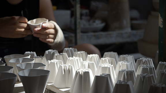 薛雷奇:其实“玉土”并非是景德镇独有。据我们考证,“玉土”最初是上世纪日本人配置出来的,其种类有多样,后来逐渐流入国内。玉土大致地说是一种将釉料打碎直接混入瓷土中的混合土,正常来说釉料直接烧制会液化凝结,但控制合适的比例,即能在瓷器烧制过程中也保持一定的刚性。玉土的优点是发挥了釉料透明的特性,使得整个胎体极其通透。由于杯子的造型特点在底部,如果是常规的瓷土在使用后难免底足沾染茶渍,唯有玉土较能清洗,所以非玉土不可。另外顶级玉土——“羊脂玉”制成的瓷器无需再另外上釉,即能在实用性上不会留有茶渍。这是我对「千字杯」的最终期待,即在工艺上也做减法,将工艺流程减到最少。并且无釉款千字杯能最极致地表现其造型感,甚至它是“锐利”的。