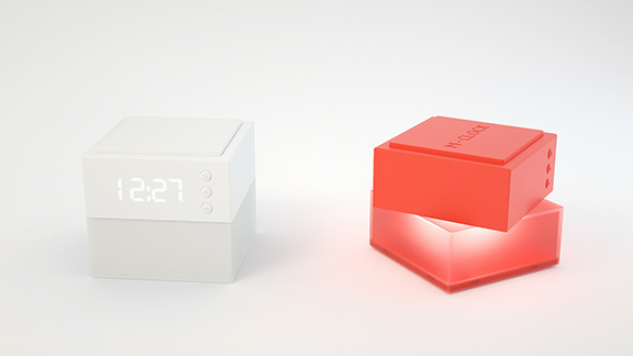 简洁现代的魔方闹钟,当我们需要看时间时,按一下顶部按键,显示时间;当我们开启小夜灯,扭转底座形态,光会从底座散发到上部分,呈现出水晶折射般的光影。