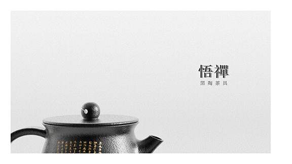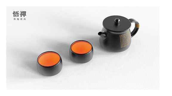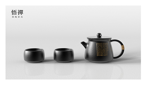 一套黑陶茶具设计,壶体上烫金佛经,壶盖上雕有一个小木鱼