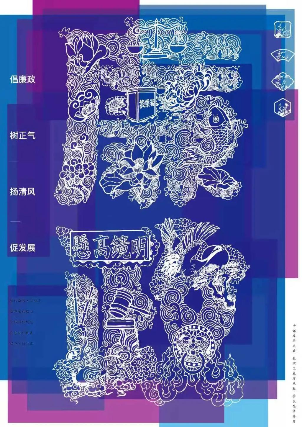 此次作品灵感来源于我们最引以为傲的汉字,因为汉字最能代表我们的传统文化。以及流传千年的传统纹样,这些纹样给我的作品注入了古典的思想。同时我也很喜欢歌川国芳的浮世绘,所以作品中也融入了浮世绘的元素。