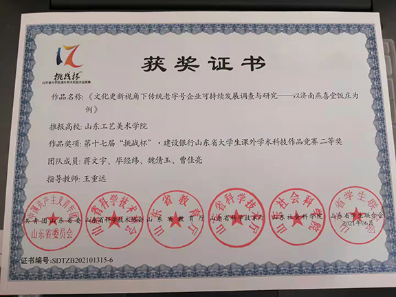 由人文艺术学院蒋文宇、毕经纬、魏倩玉、曹佳亮四位同学组成的团队凭借作品《文化更新视角下传统老字号企业可持续发展调查与研究——以济南燕喜堂饭庄为例》荣获省赛二等奖,本次采访联系到了团队队长蒋文宇同学。