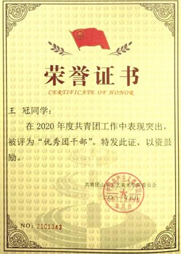 工作上,任2019级纤维与染织班团支部书记,所在班级2019级纤维与染织班被评为“先进团支部”、“五星级团支部”。此外,也先后荣获“2019-2020学年校级优秀学生”、“2019年度校级优秀团干部”、“2020年度校级优秀团干部”、“2020-2021学年校级优秀学生干部”等荣誉称号。
