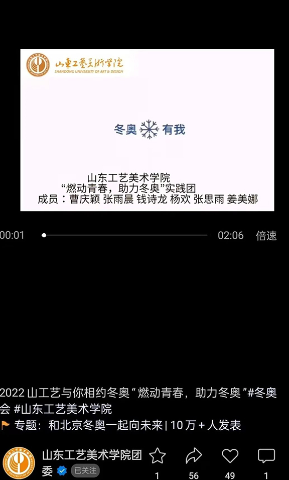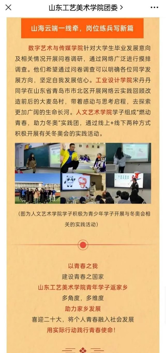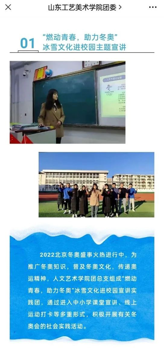2022年寒假参与“返家乡”社会实践活动、青鸟计划、“希望小屋”大学生志愿服务项目、民艺调研等活动。在2022年北京冬奥会来临之际,以线上云组队+线下实地宣讲相结合的方式,组成助力冬奥的实践团,与团队成员在各自家乡中小学开展宣讲活动,得到学习强国平台的推出。