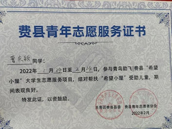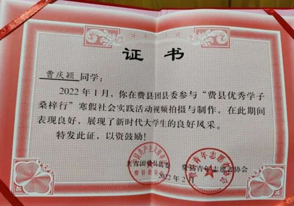 2021年暑期曹庆颖和其他同学自发组成“助力乡村振兴路实践调研团”去往山东菏泽曹县开展乡村振兴实践活动。在实践活动进行的如火如荼的同时,曹庆颖同学还主动投身于2021年暑期进行青鸟计划实践,在完成基本工作的同时担任政务实践第二团支部宣传委员。