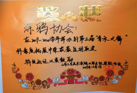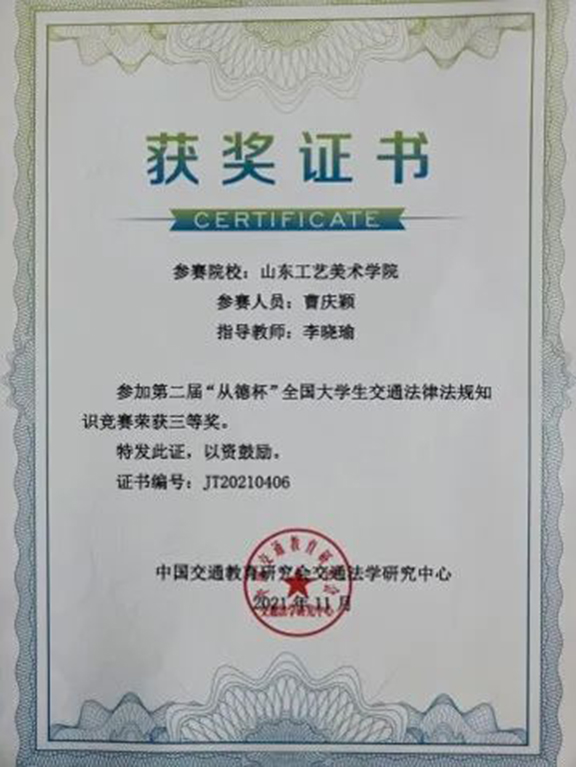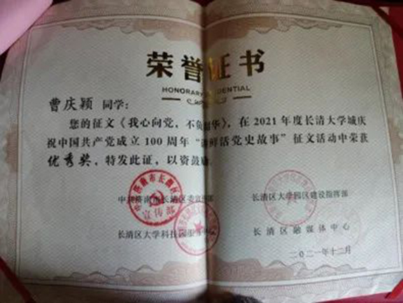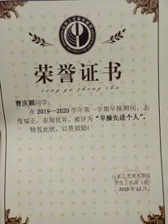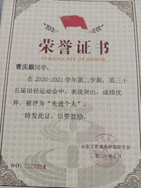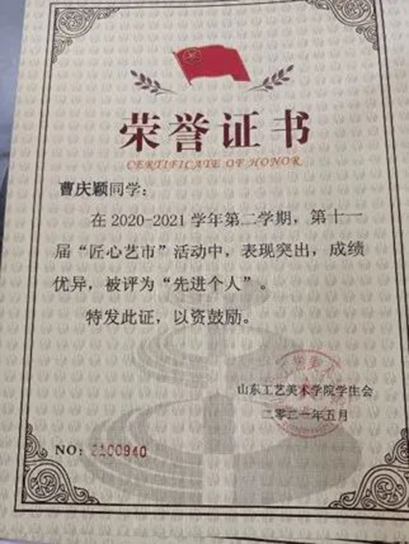 在学习方面,曹庆颖同学也严格要求自己。她努力学习专业知识,2019-2020学年获得“综合二等奖学金”,2020-2021学年获得“综合一等奖学金”。“第二课堂”成绩位列班级第一,获得304am永利集团官网第二届“二课达人”称号。