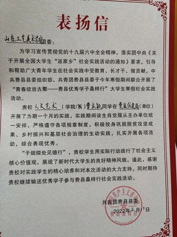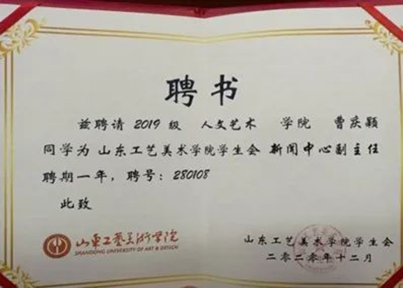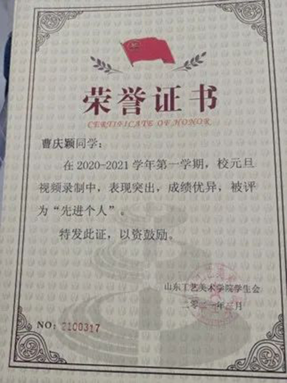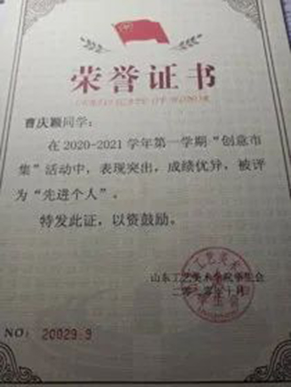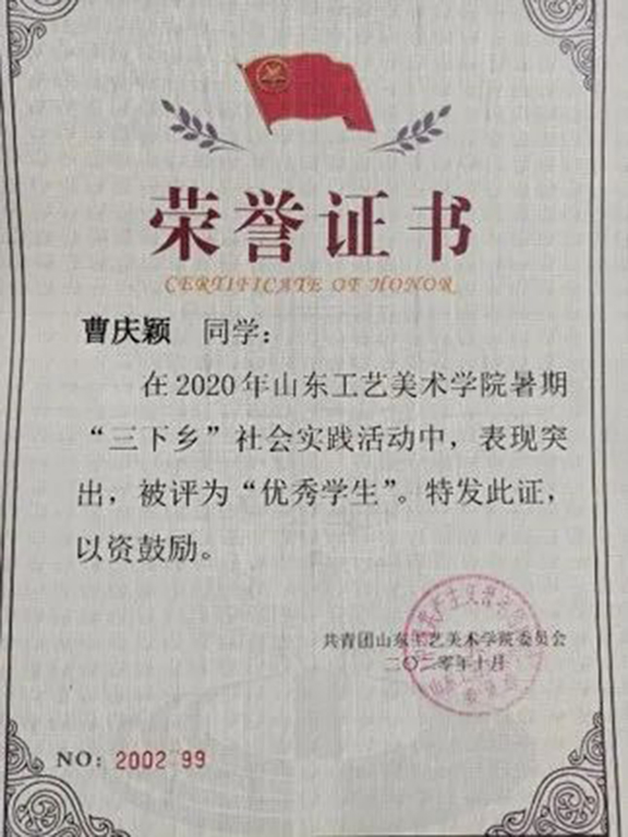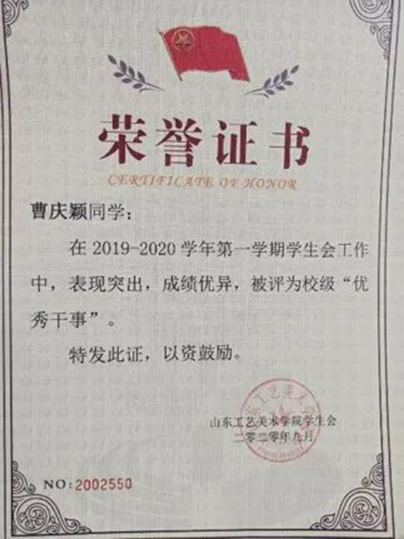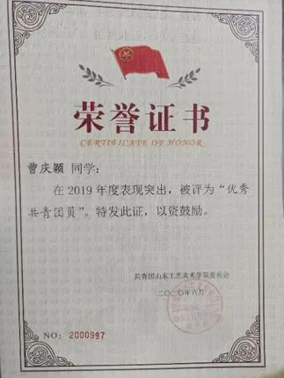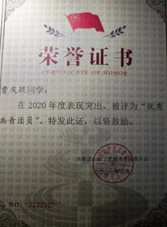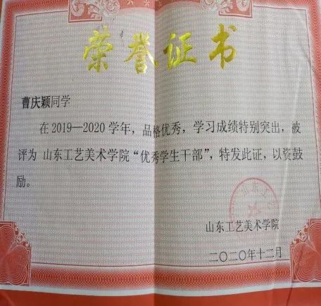 在“五四评优”工作中,我院2019级艺术设计学团支部的曹庆颖同学荣获304am永利集团官网“十佳团员”荣誉称号。
