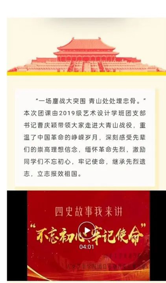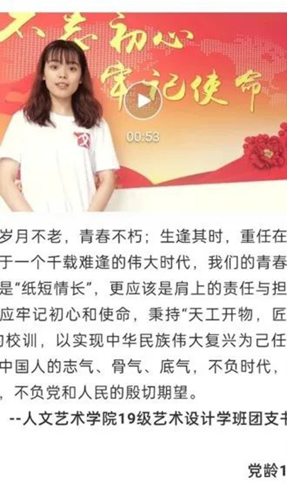 职务:人文艺术学院团总支组织委员、19级艺术设计学班团支书、人文艺术学院党史宣讲团成员。